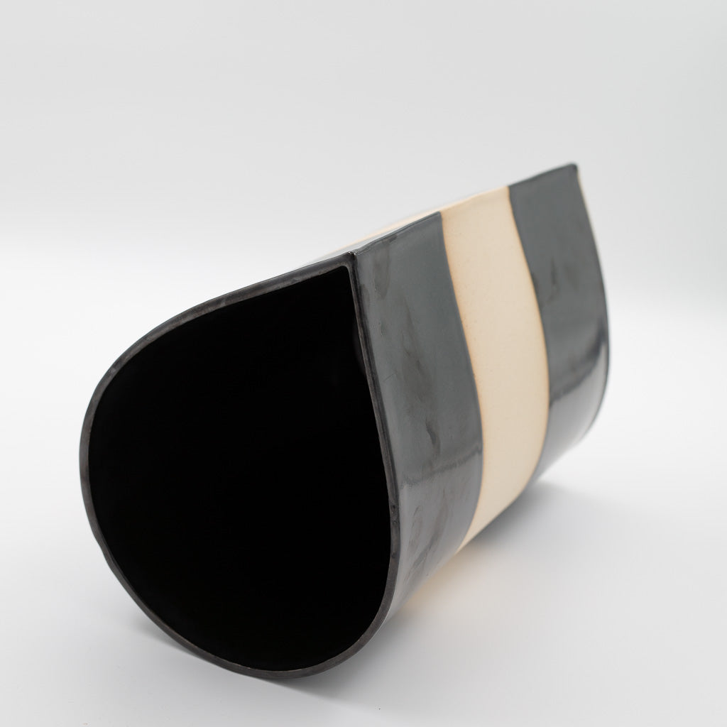 This vase is created using slabs of stoneware clay that are formed and thinned without the use of a mechanical roller or machinery. The clay is stretched, cut, trimmed and fastened entirely by hand.