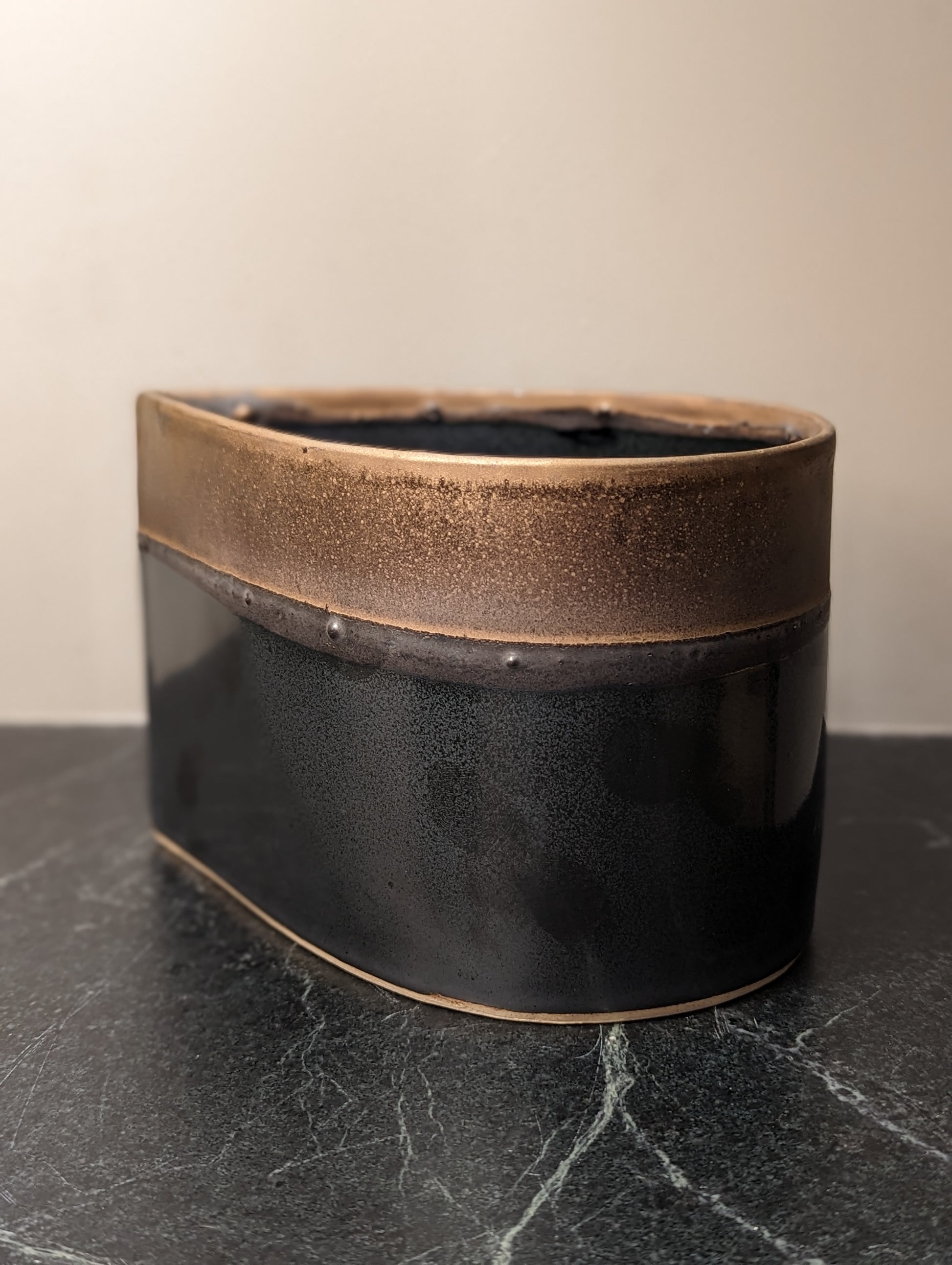 During this second firing the glaze melts and becomes glass. The midsection of the vase is left unglazed to expose the raw clay body. This rough/smooth contrast draws both the eye and the hand to explore the vessel.